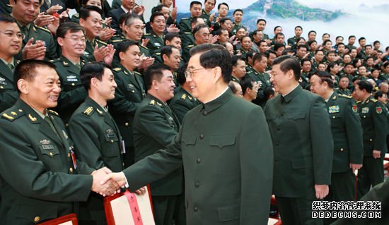 资料图:10月27日,胡锦涛和习近平在北京会见国防大学第五次党代表大会全体代表。