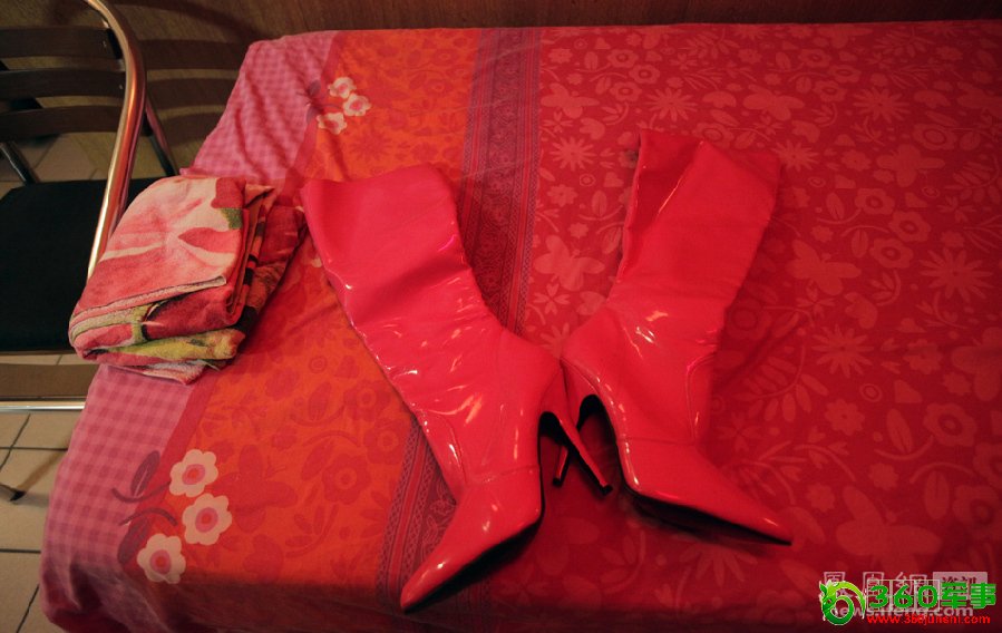 Martine工作时要穿的长靴被整齐地摆在床上。